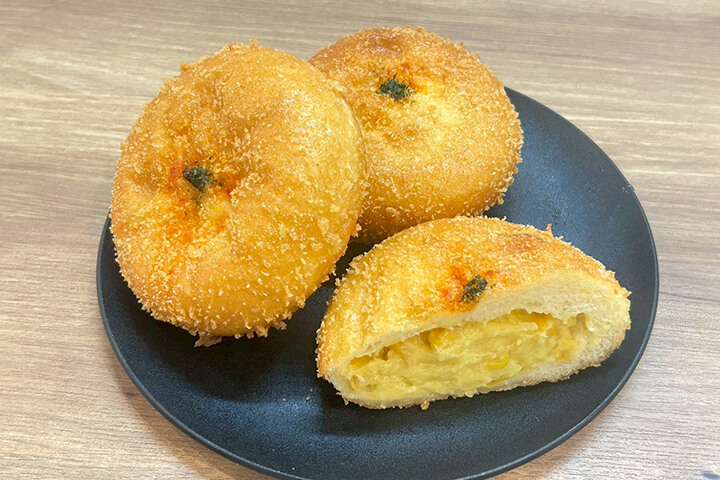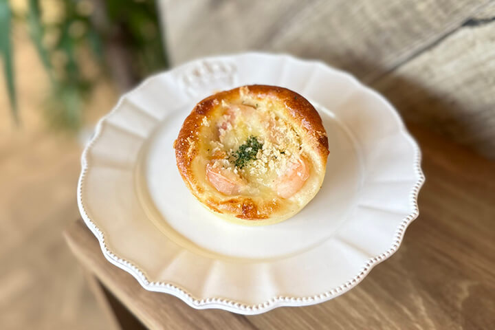 - (1)えびグラタン360円、(2)コーンポタージュドーナツ290円、(3)ブリオッシュタルトイチゴ1,000円 / 4分1サイズ250円、(4)クロワッサンのクロックムッシュ480円