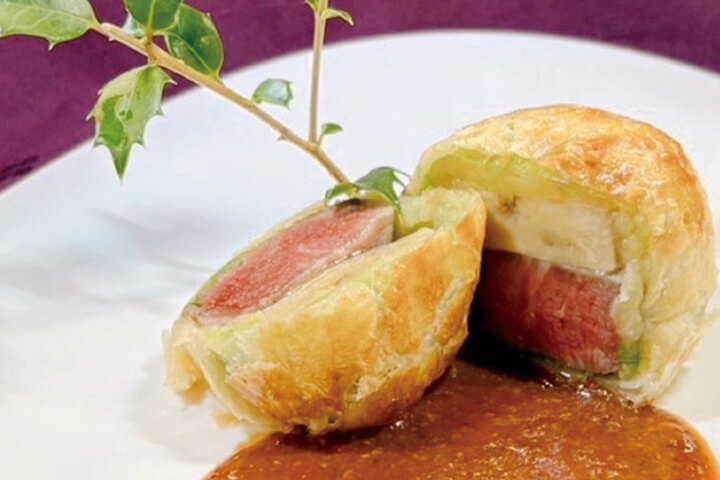 コースのメイン料理は岩手純情牛フィレ肉とフォアグラ・ザボイキャベツのパイ包み焼 黒トリュフソースです - 山口市阿知須7395-1